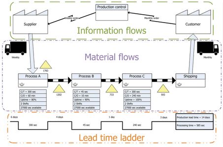 Değer akış haritası ham maddenin nihai ürüne dönüşme sürecindeki bir üreticiden diğer üreticiye ve son kullanıcıya kadar olan tüm adımları ve israfları içerir.